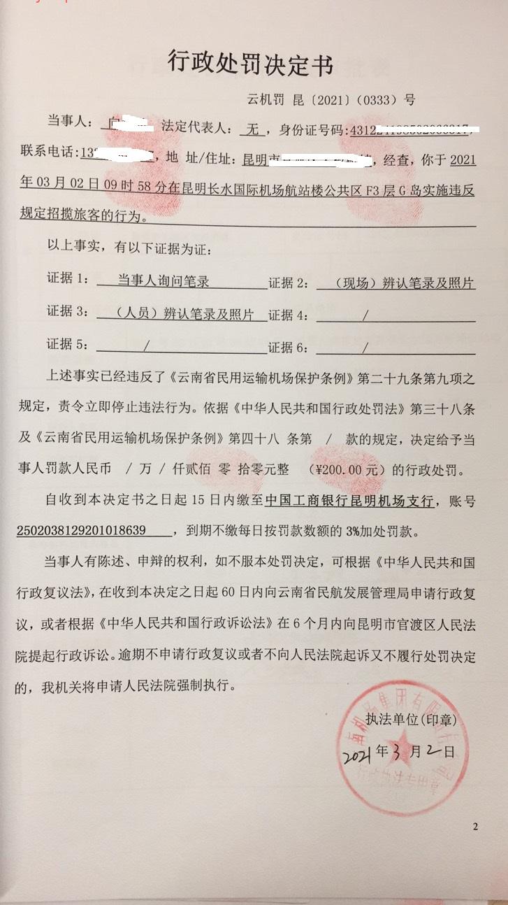 行政处罚决定书 云机罚 昆{2021} (0334)号