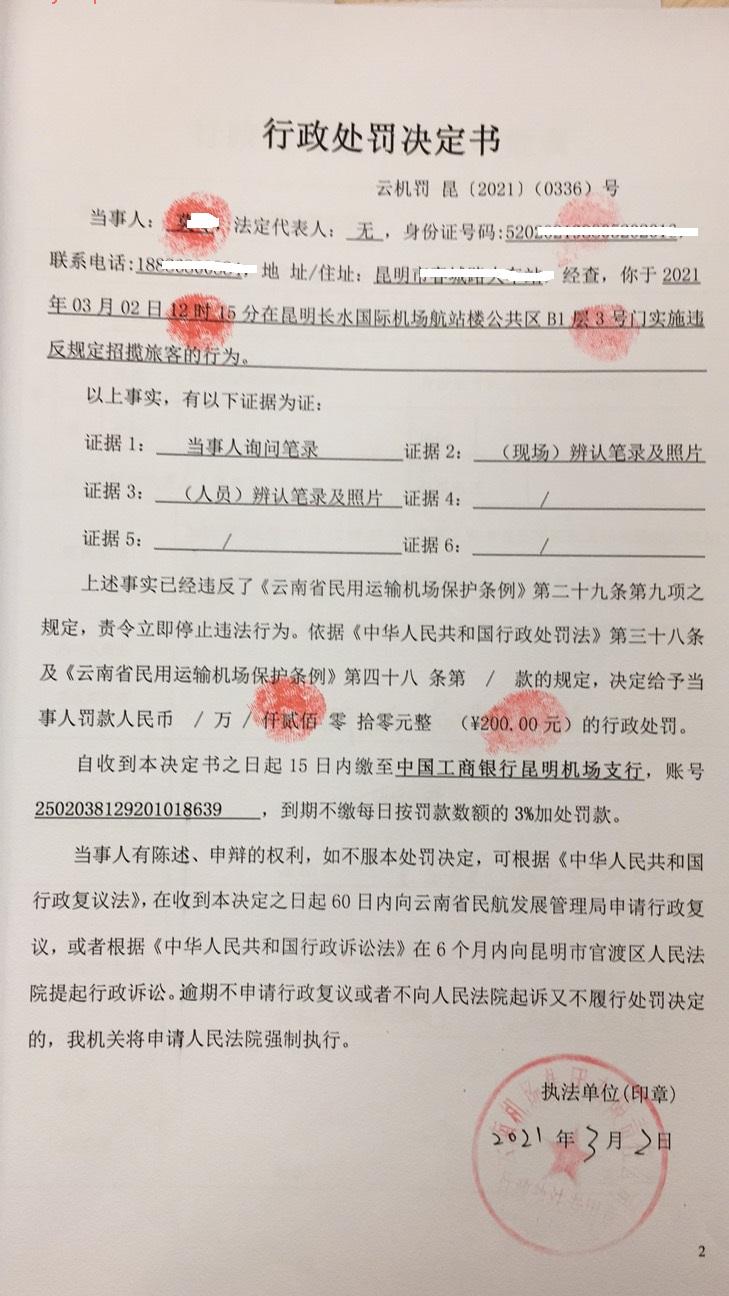 行政处罚决定书 云机罚 昆{2021} (0336)号