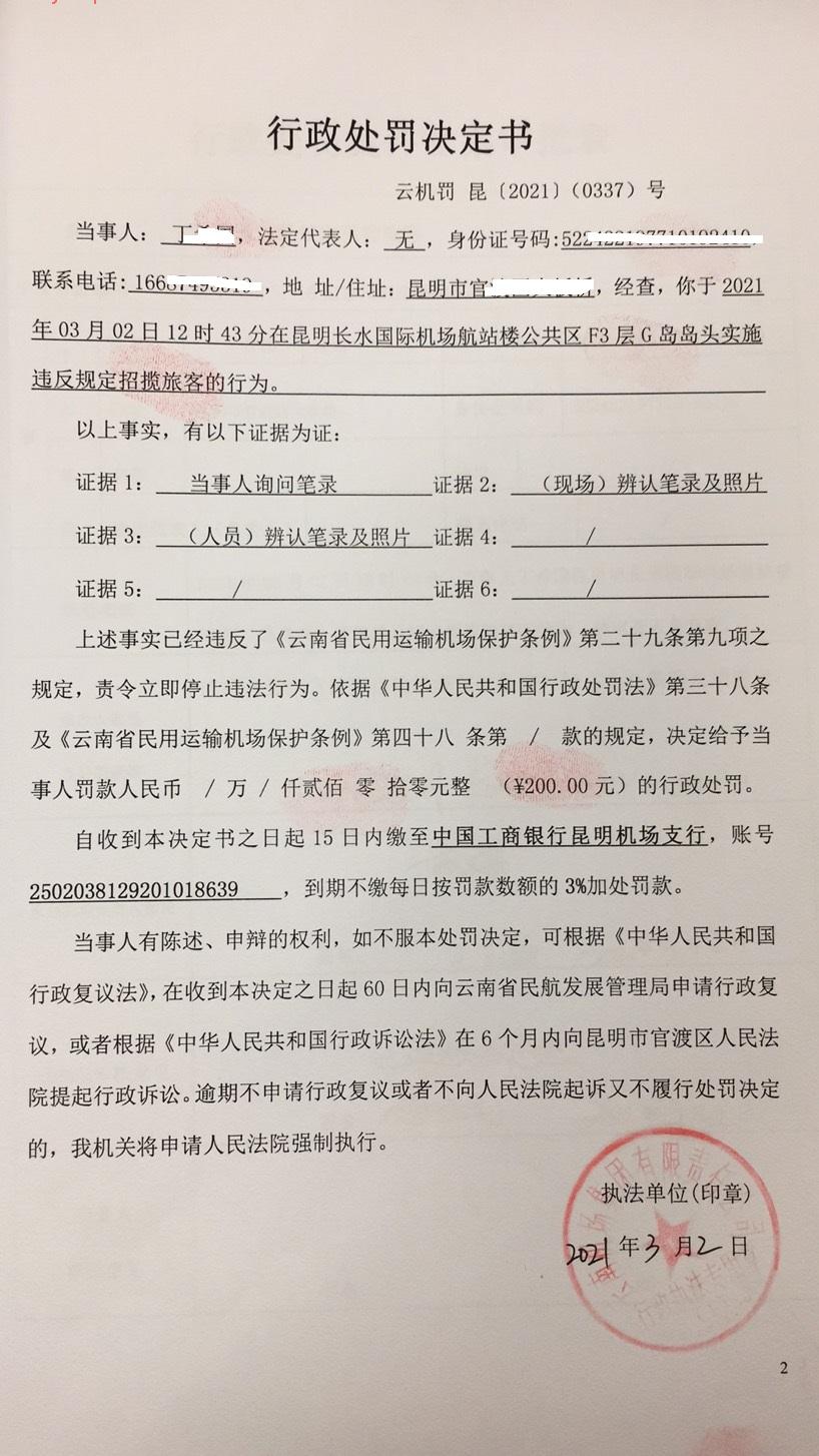 行政处罚决定书 云机罚 昆{2021} (0338)号