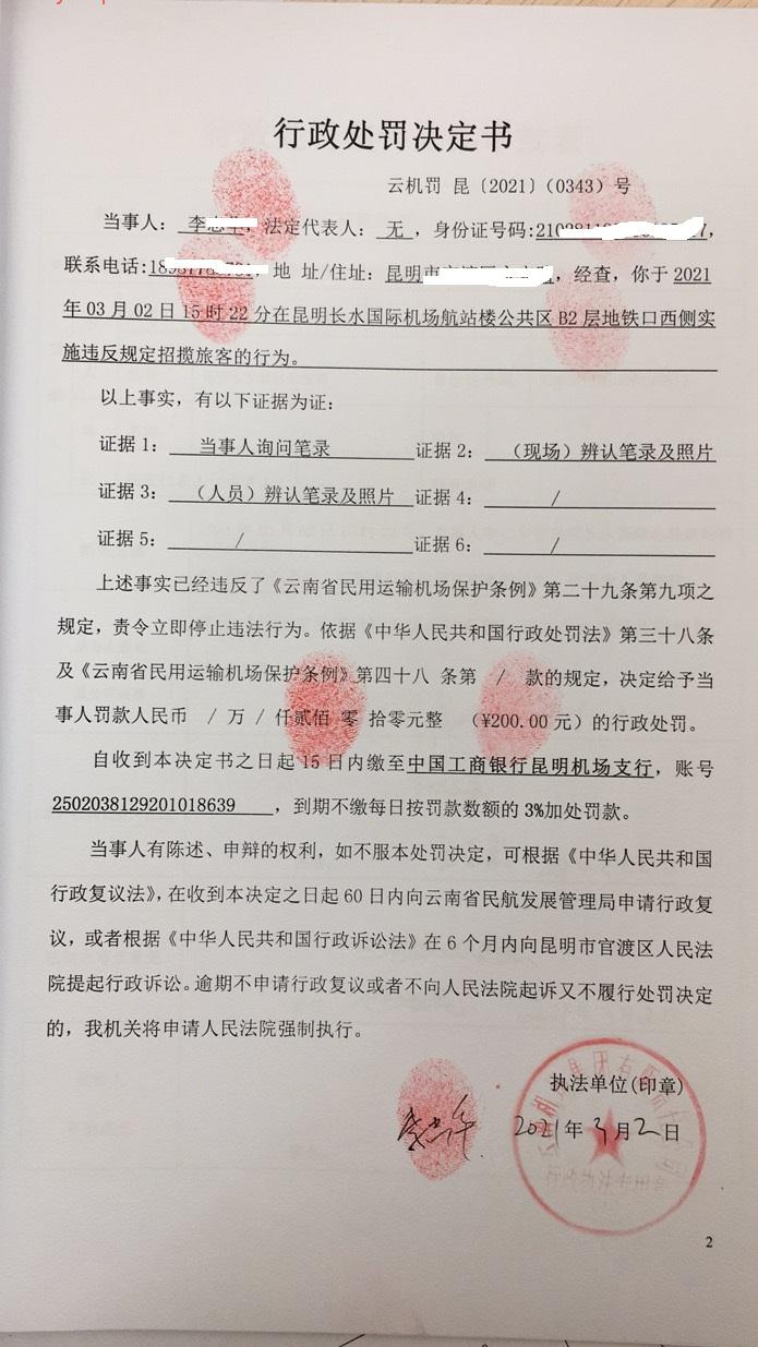 行政处罚决定书 云机罚 昆{2021} (0343)号