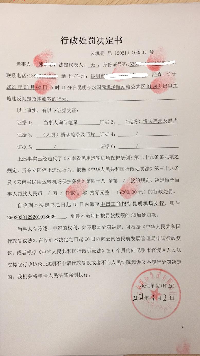 行政处罚决定书 云机罚 昆{2021} (0349)号