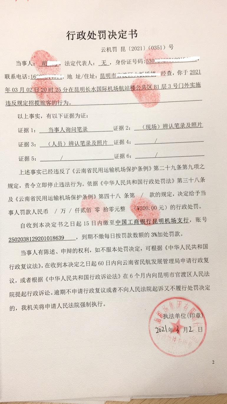 行政处罚决定书 云机罚 昆{2021} (0351)号