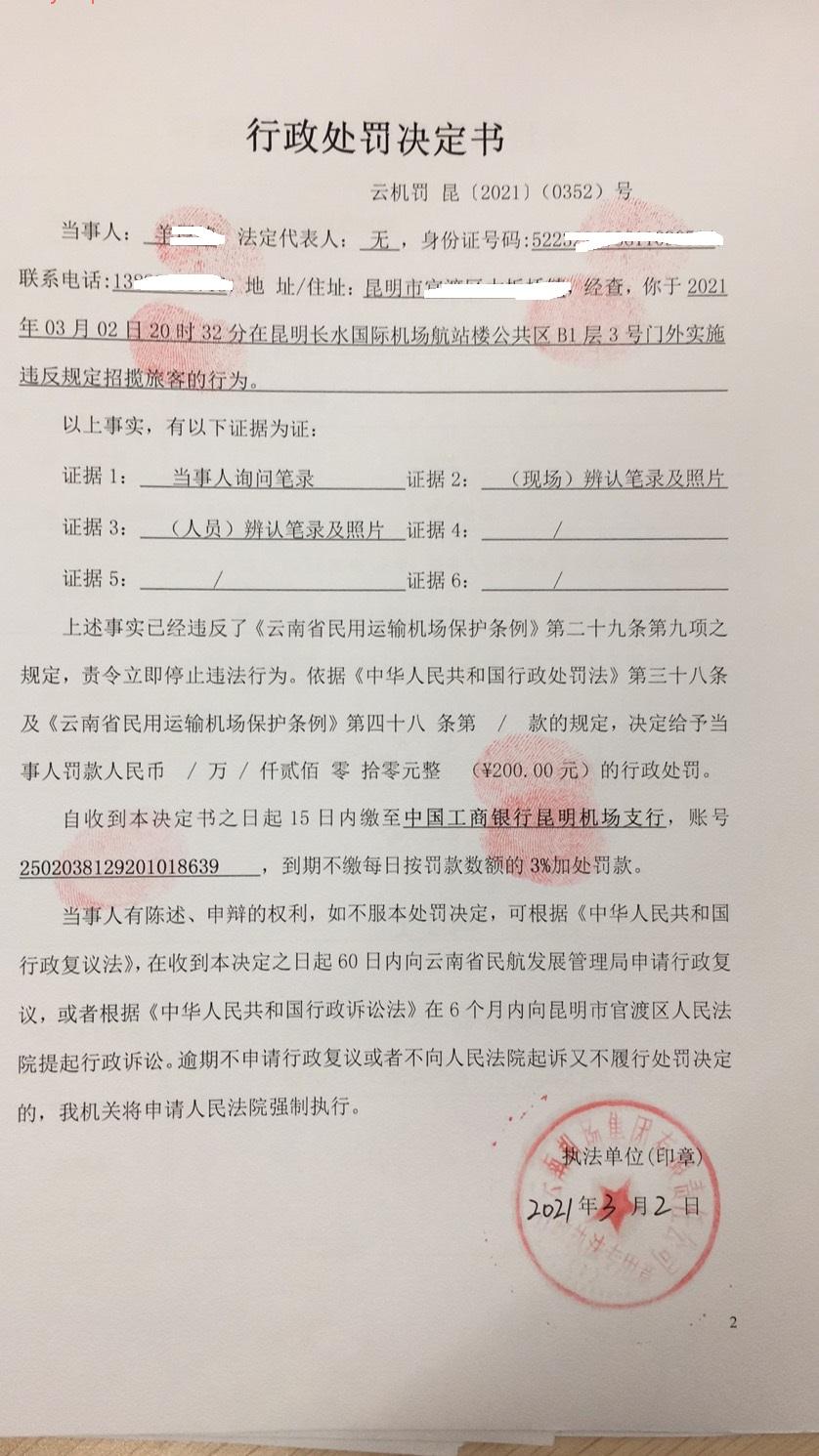 行政处罚决定书 云机罚 昆{2021} (0353)号