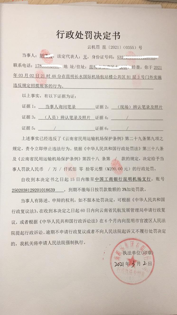 行政处罚决定书 云机罚 昆{2021} (0355)号