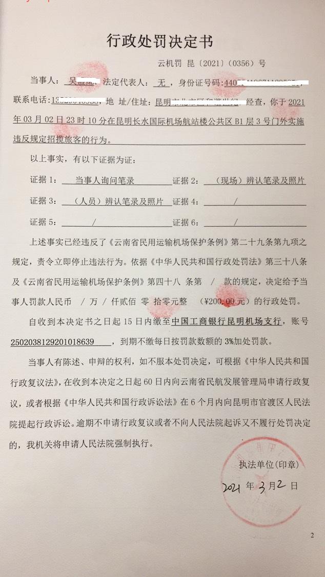 行政处罚决定书 云机罚 昆{2021} (0355)号