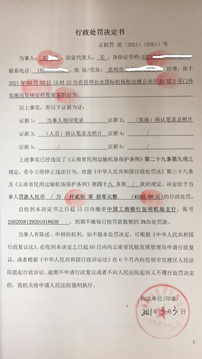 行政处罚决定书 云机罚 昆{2021} (0360)号