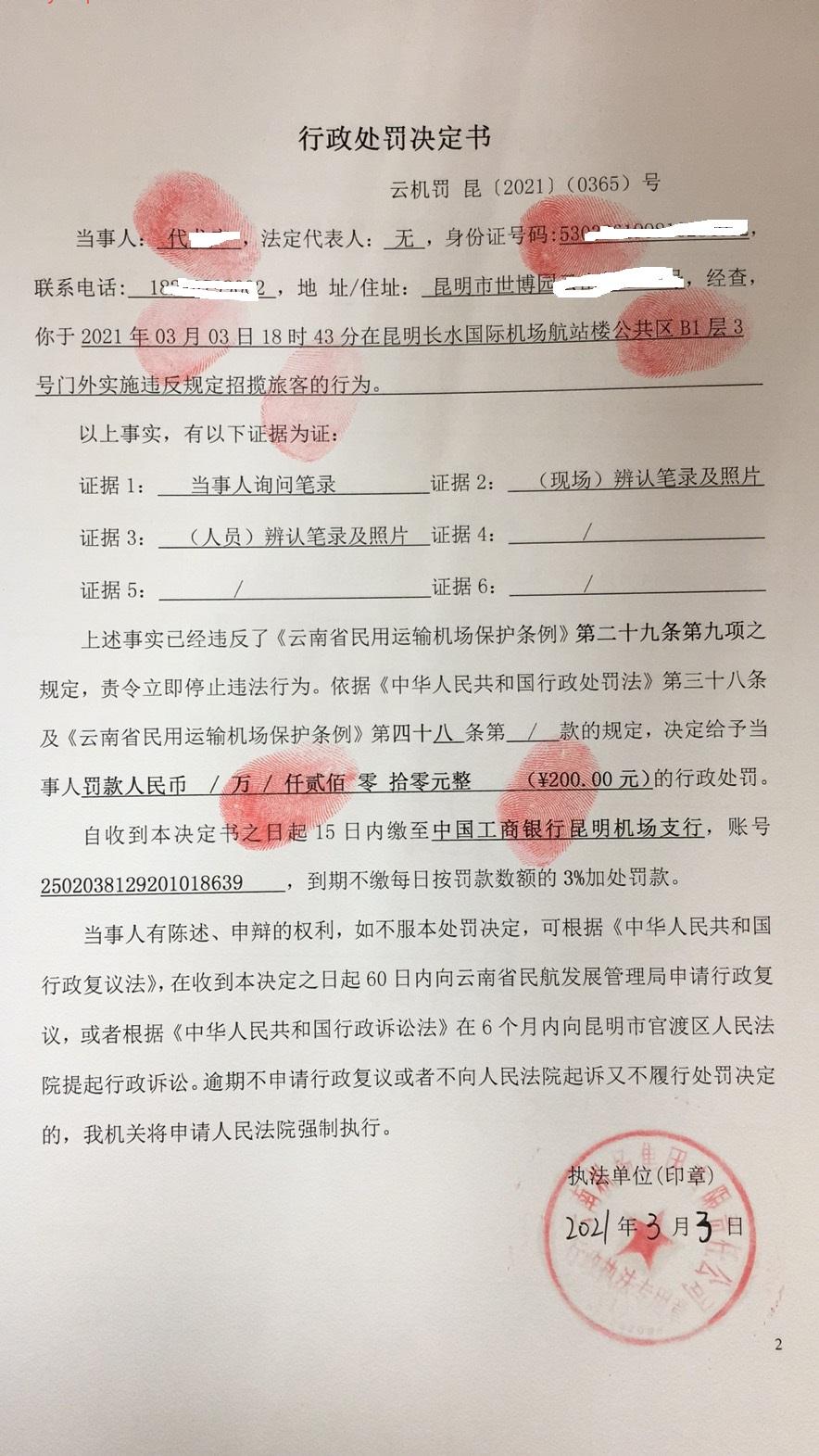 行政处罚决定书 云机罚 昆{2021} (0365)号