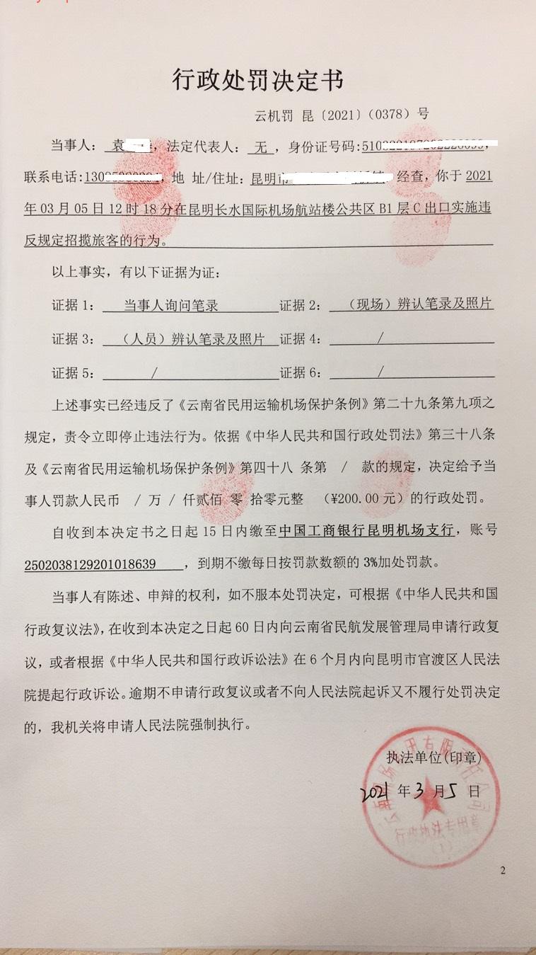 行政处罚决定书 云机罚 昆{2021} (0378)号