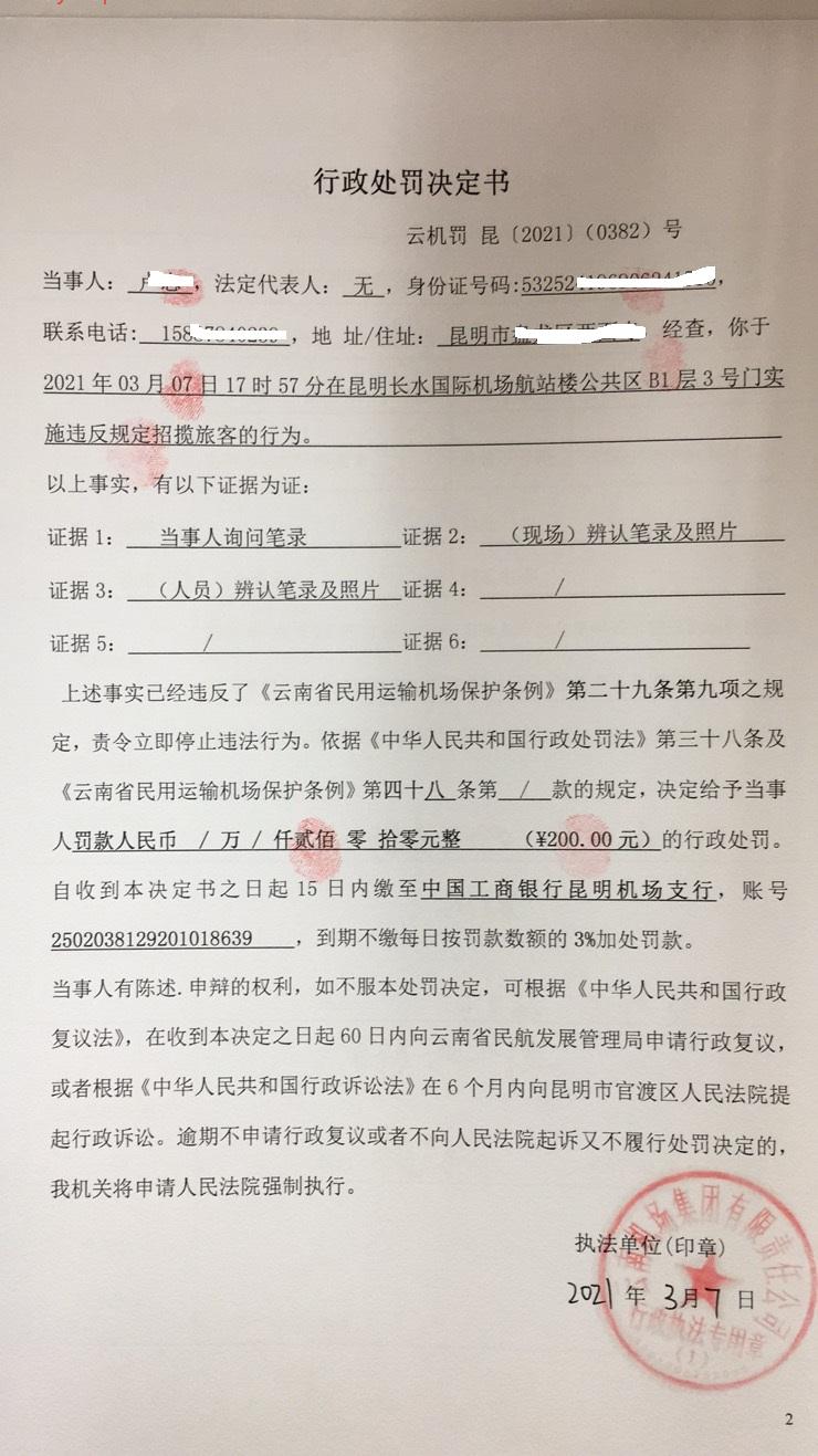 行政处罚决定书 云机罚 昆{2021} (0382)号