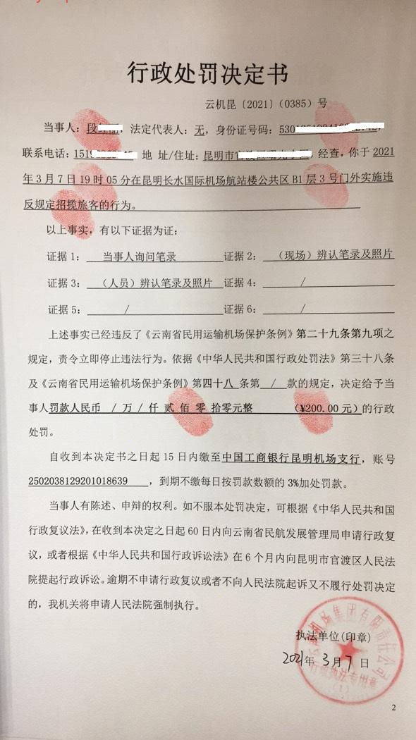 行政处罚决定书 云机罚 昆{2021} (0384)号