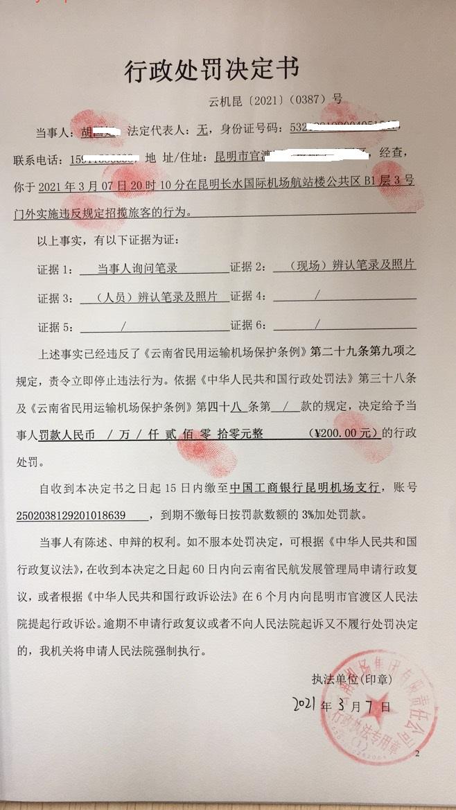 行政处罚决定书 云机罚 昆{2021} (0387)号