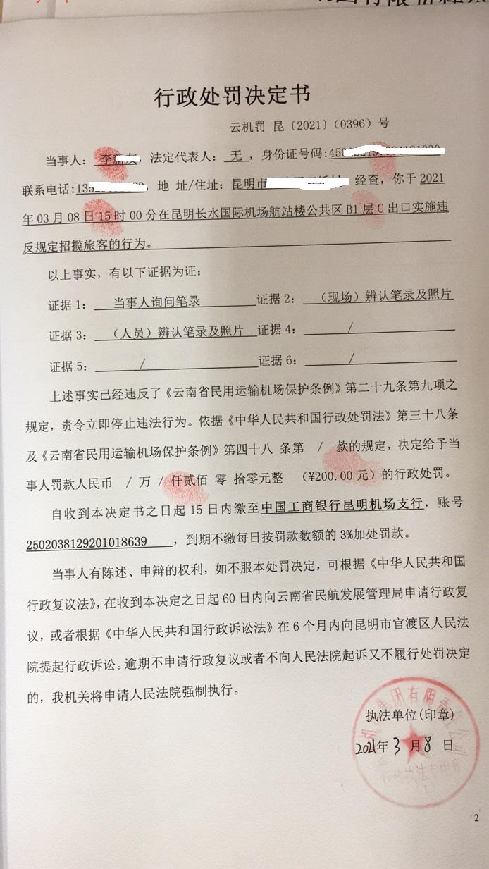行政处罚决定书 云机罚 昆{2021} (0396)号