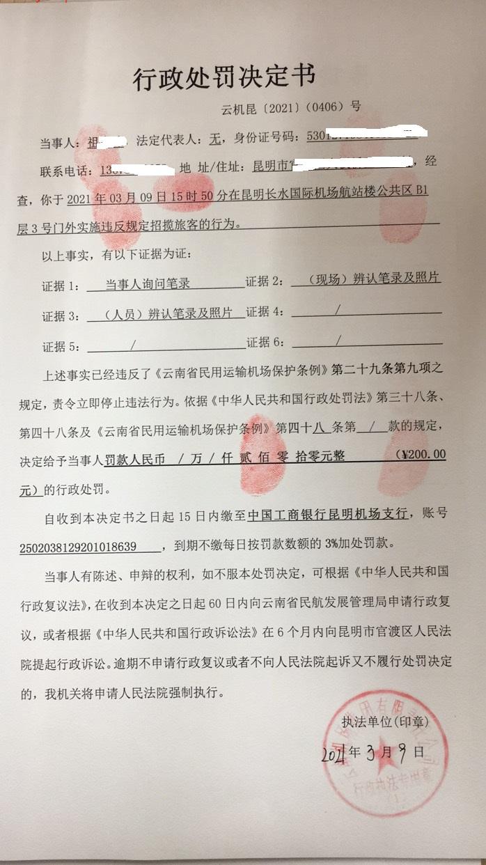 行政处罚决定书 云机罚 昆{2021} (0405)号