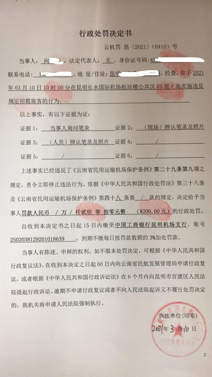 行政处罚决定书 云机罚 昆{2021} (0410)号