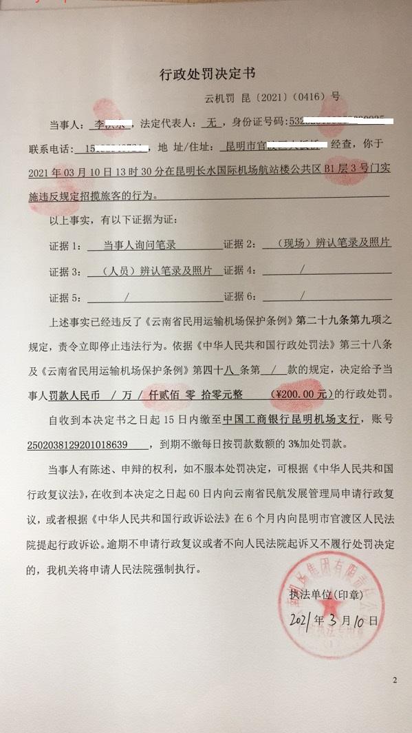行政处罚决定书 云机罚 昆{2021} (0416)号