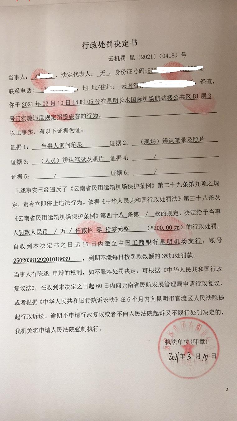行政处罚决定书 云机罚 昆{2021} (0418)号