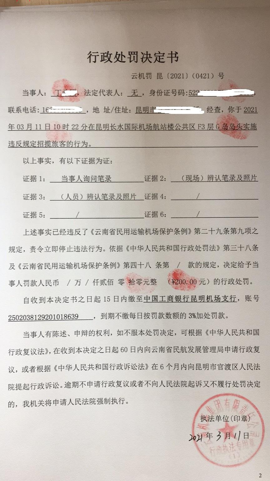 行政处罚决定书 云机罚 昆{2021} (0420)号