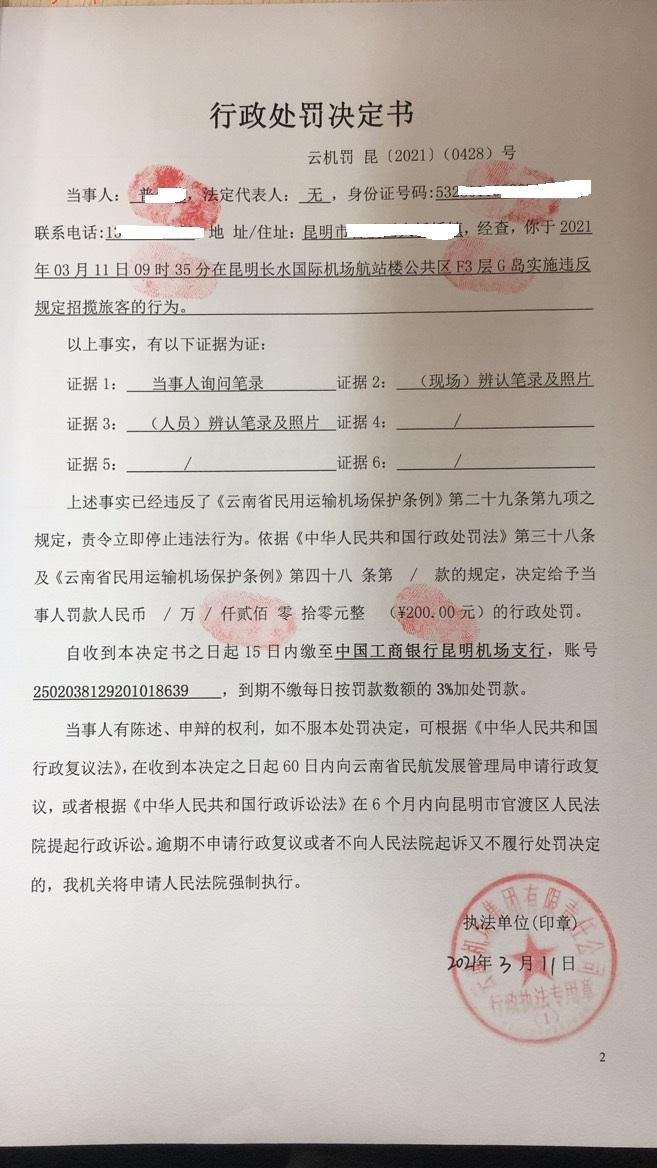行政处罚决定书 云机罚 昆{2021} (0429)号