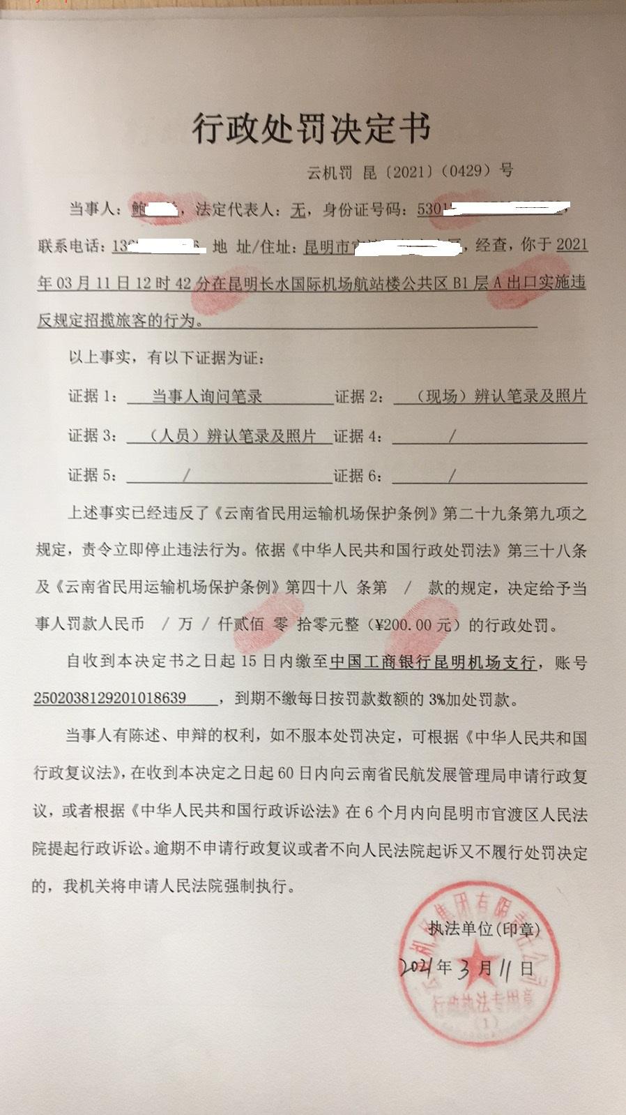 行政处罚决定书 云机罚 昆{2021} (0429)号