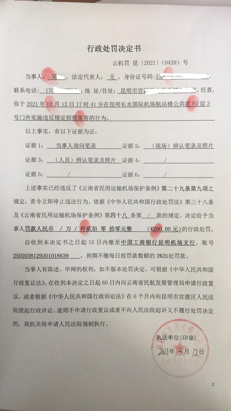 行政处罚决定书 云机罚 昆{2021} (0438)号