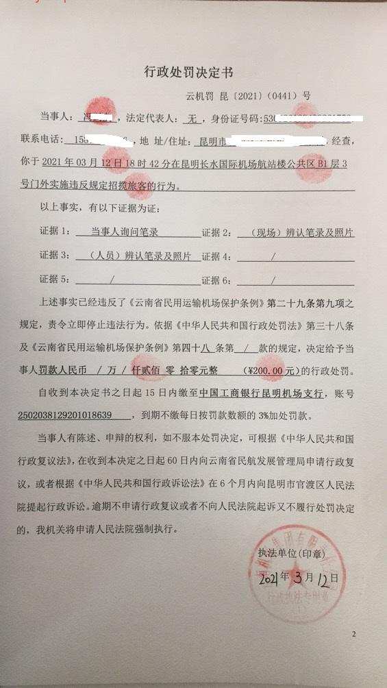 行政处罚决定书 云机罚 昆{2021} (0442)号