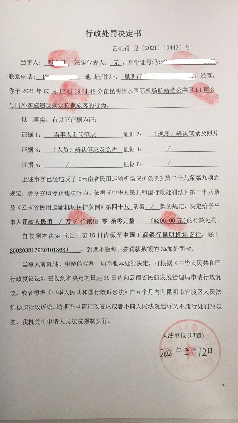 行政处罚决定书 云机罚 昆{2021} (0443)号
