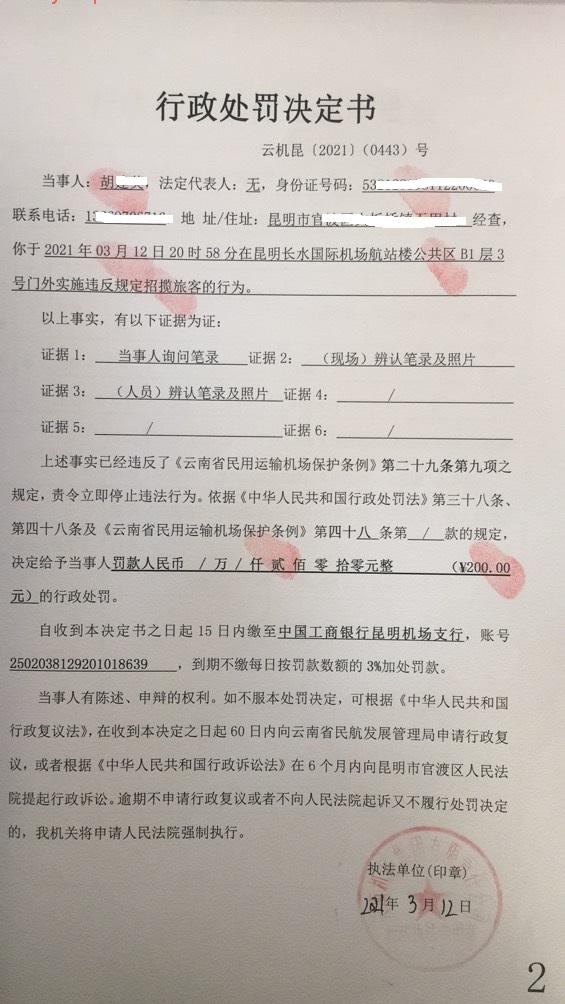 行政处罚决定书 云机罚 昆{2021} (0443)号