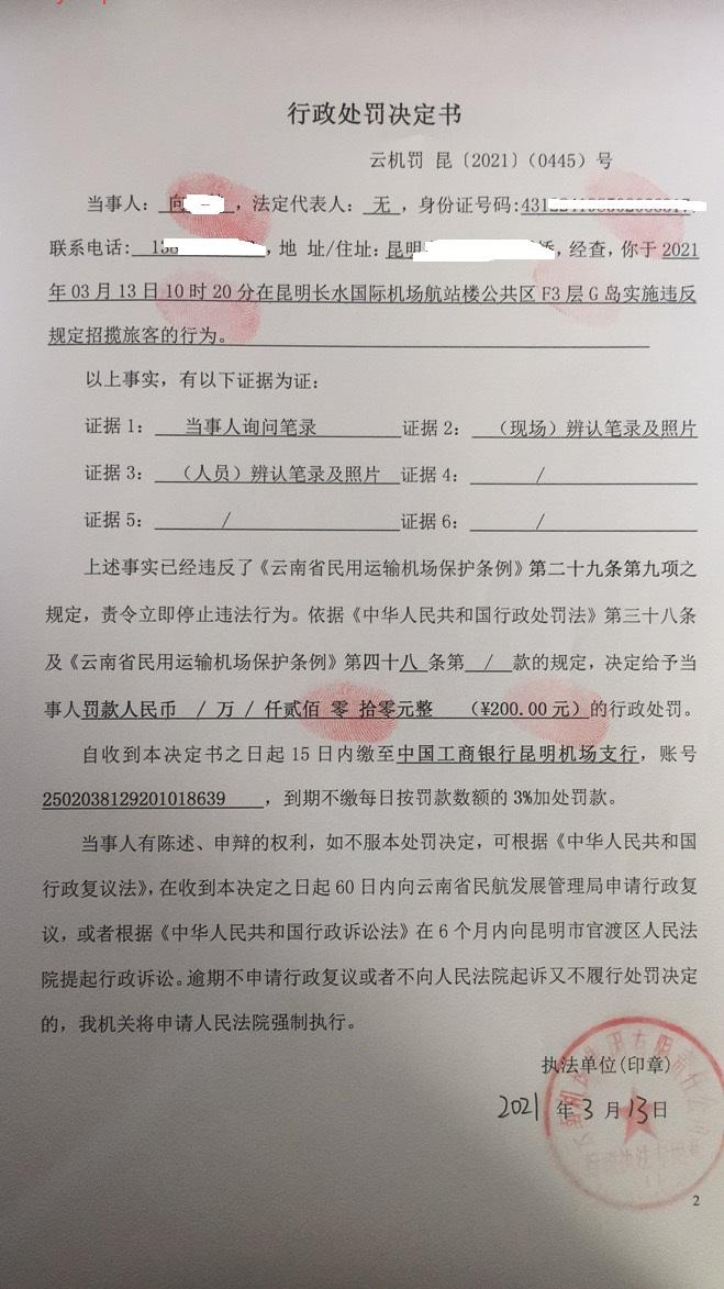 行政处罚决定书 云机罚 昆{2021} (0445)号