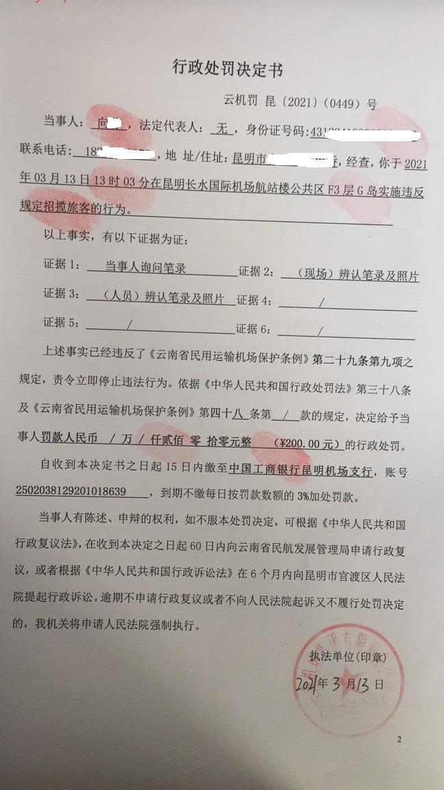 行政处罚决定书 云机罚 昆{2021} (0448)号