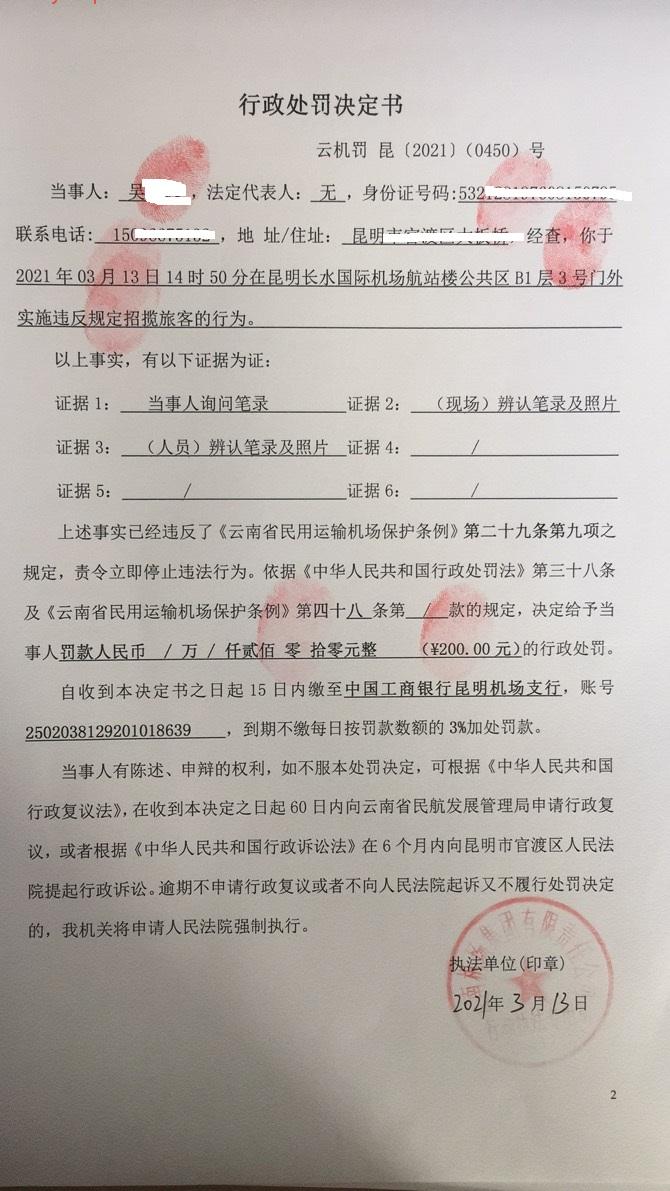 行政处罚决定书 云机罚 昆{2021} (0451)号
