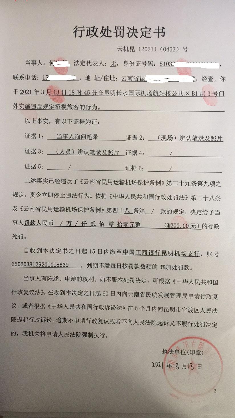 行政处罚决定书 云机罚 昆{2021} (0452)号