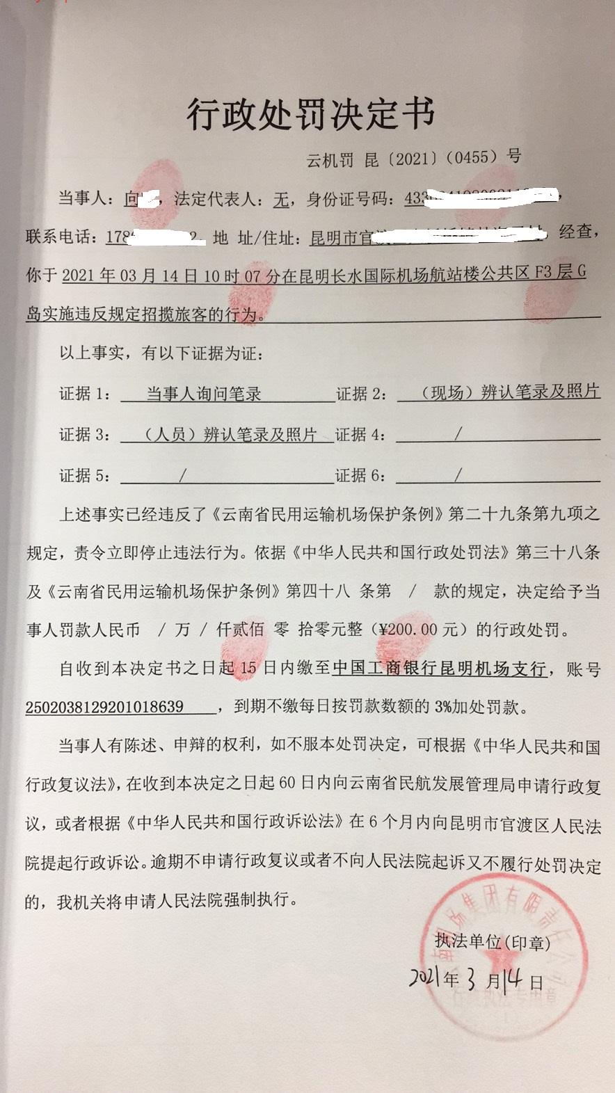 行政处罚决定书 云机罚 昆{2021} (0455)号