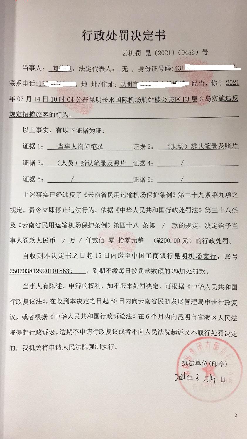 行政处罚决定书 云机罚 昆{2021} (0455)号