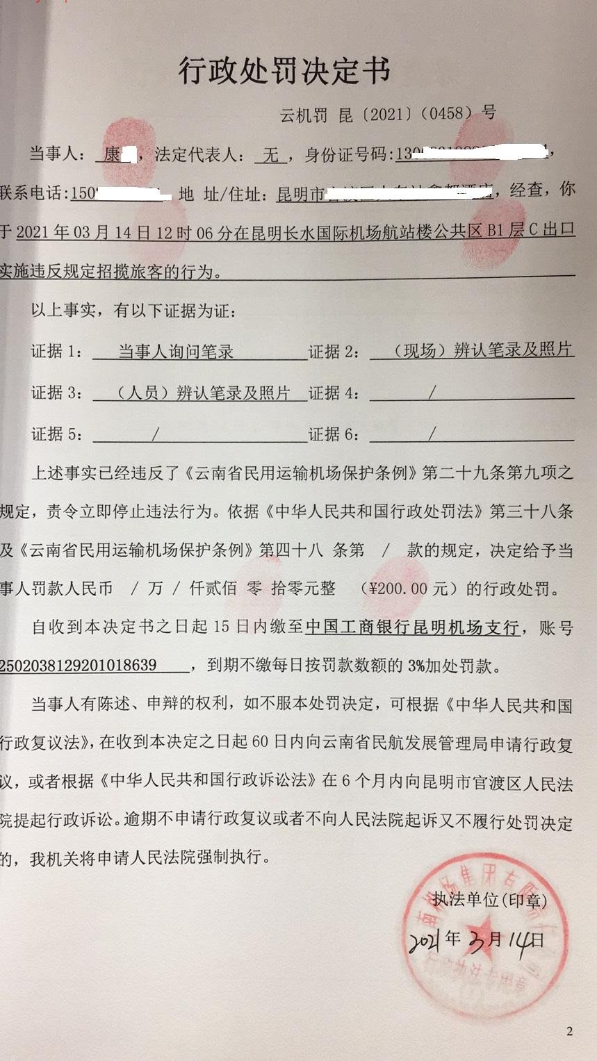 行政处罚决定书 云机罚 昆{2021} (0458)号