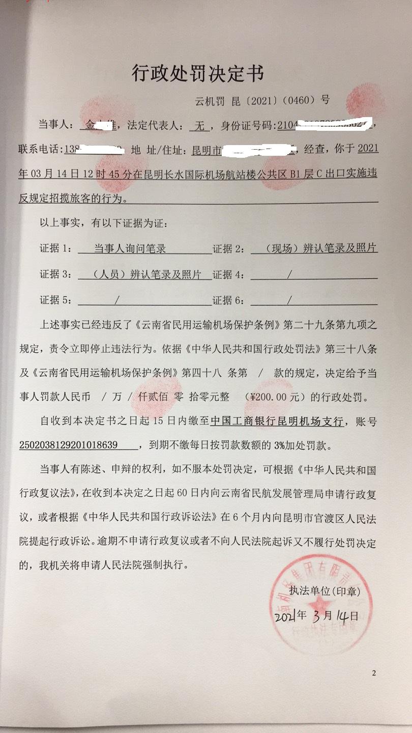 行政处罚决定书 云机罚 昆{2021} (0460)号