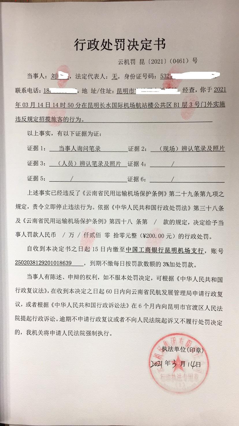 行政处罚决定书 云机罚 昆{2021} (0461)号