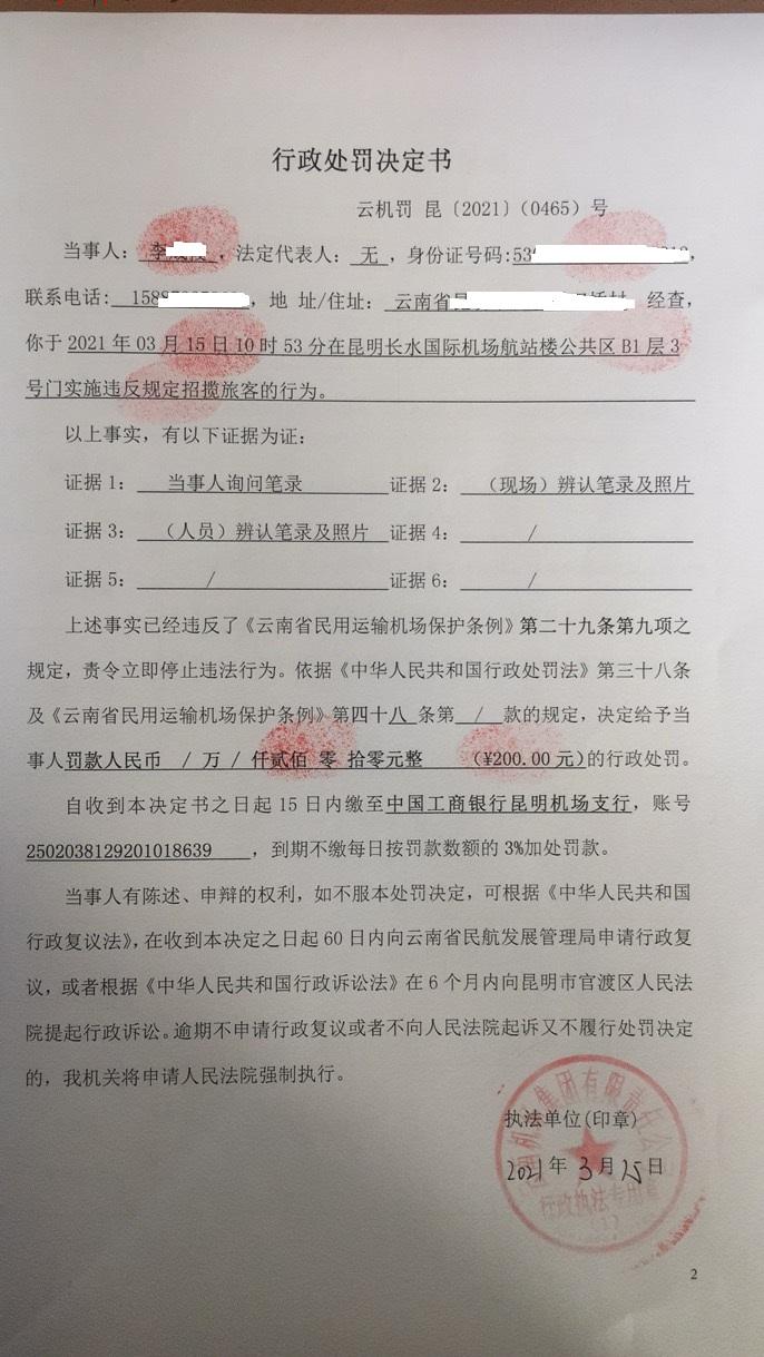 行政处罚决定书 云机罚 昆{2021} (0465)号