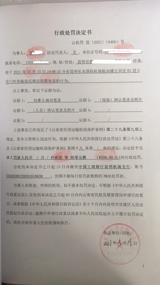 行政处罚决定书 云机罚 昆{2021} (0465)号
