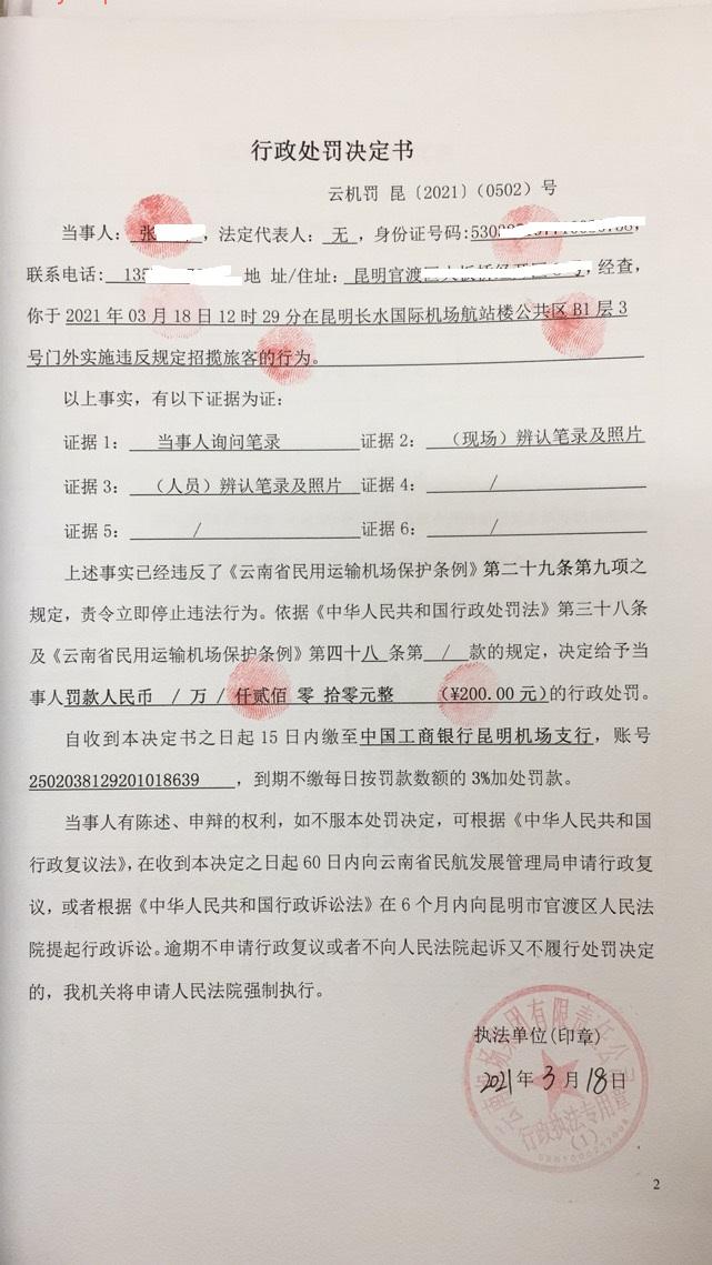 行政处罚决定书 云机罚 昆{2021} (0502)号