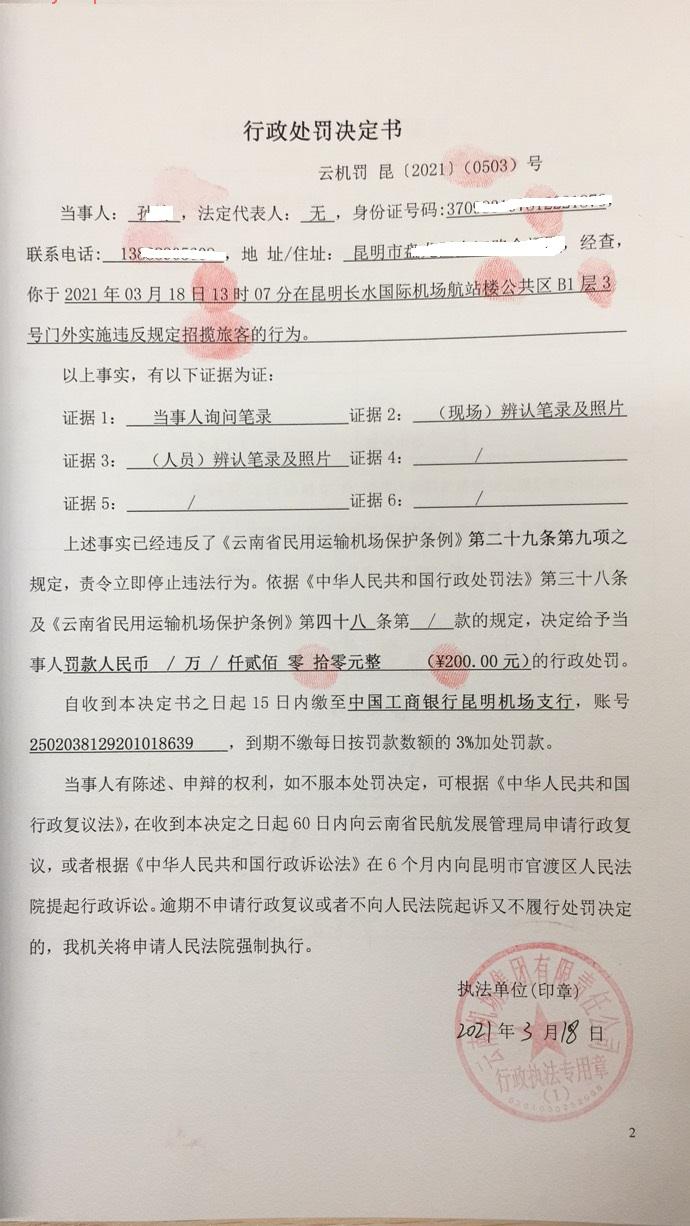 行政处罚决定书 云机罚 昆{2021} (0503)号