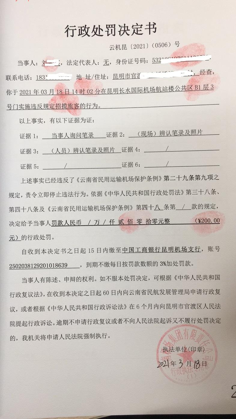 行政处罚决定书 云机罚 昆{2021} (0506)号