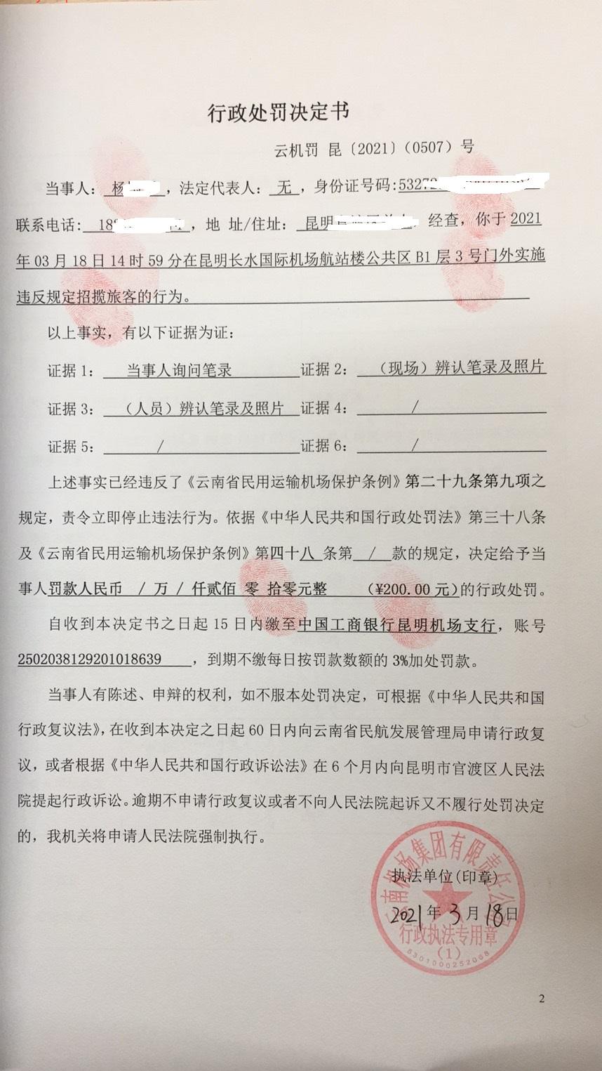 行政处罚决定书 云机罚 昆{2021} (0507)号