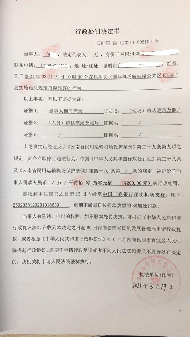 行政处罚决定书 云机罚 昆{2021} (0510)号