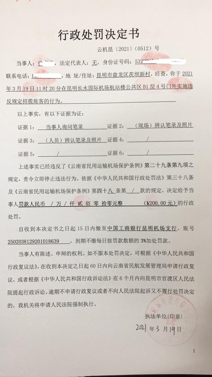 行政处罚决定书 云机罚 昆{2021} (0513)号