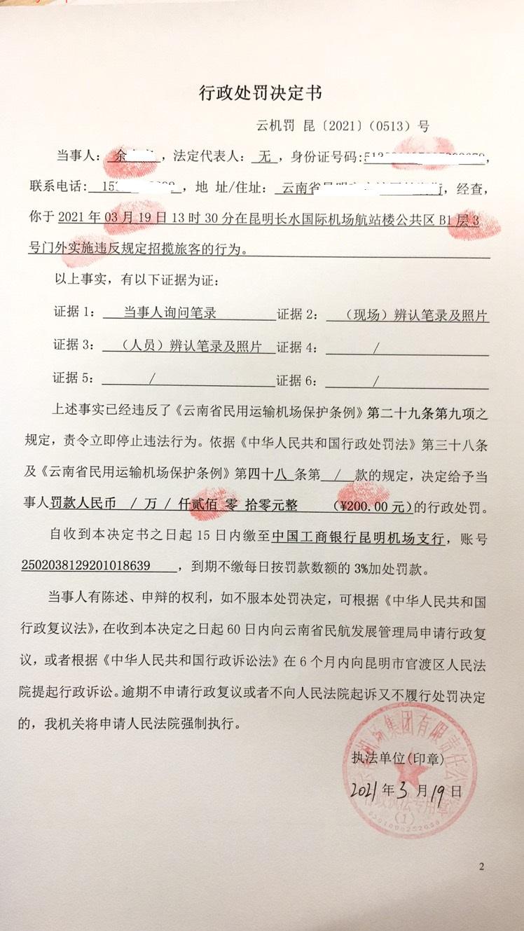 行政处罚决定书 云机罚 昆{2021} (0513)号