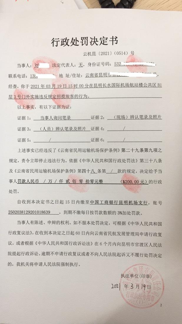 行政处罚决定书 云机罚 昆{2021} (0513)号