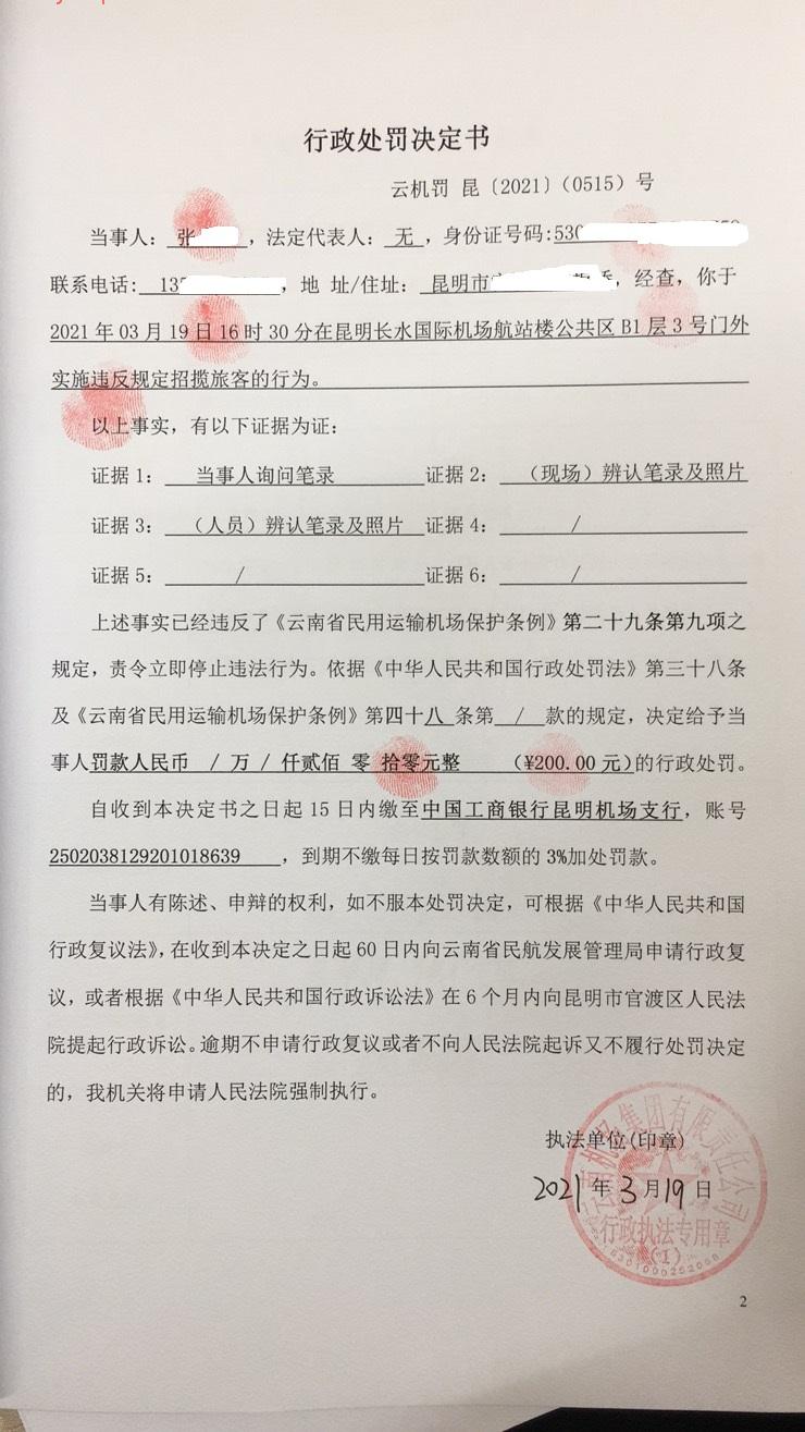 行政处罚决定书 云机罚 昆{2021} (0515)号