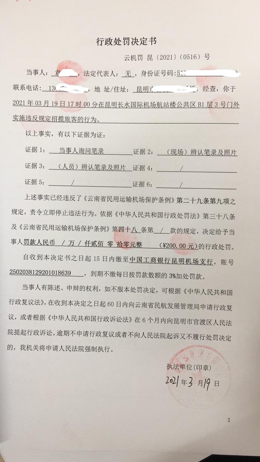 行政处罚决定书 云机罚 昆{2021} (0516)号