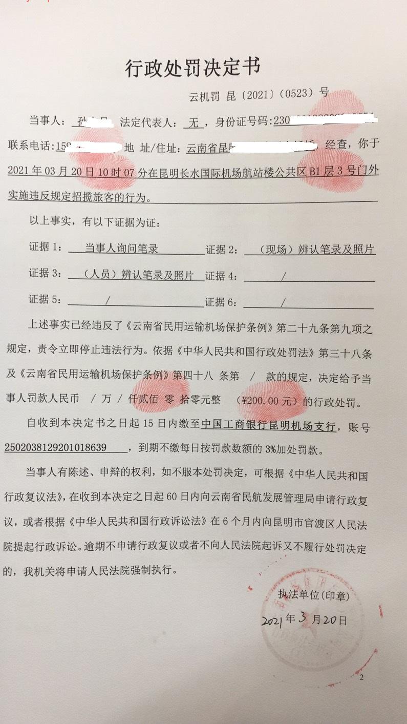 行政处罚决定书 云机罚 昆{2021} (0523)号