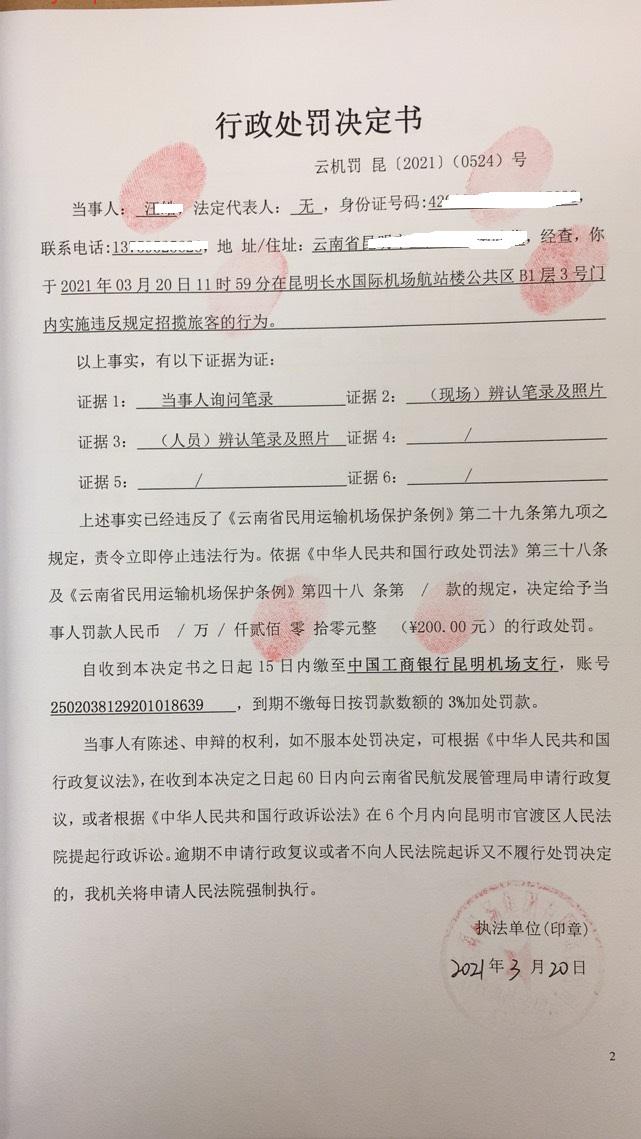 行政处罚决定书 云机罚 昆{2021} (0524)号